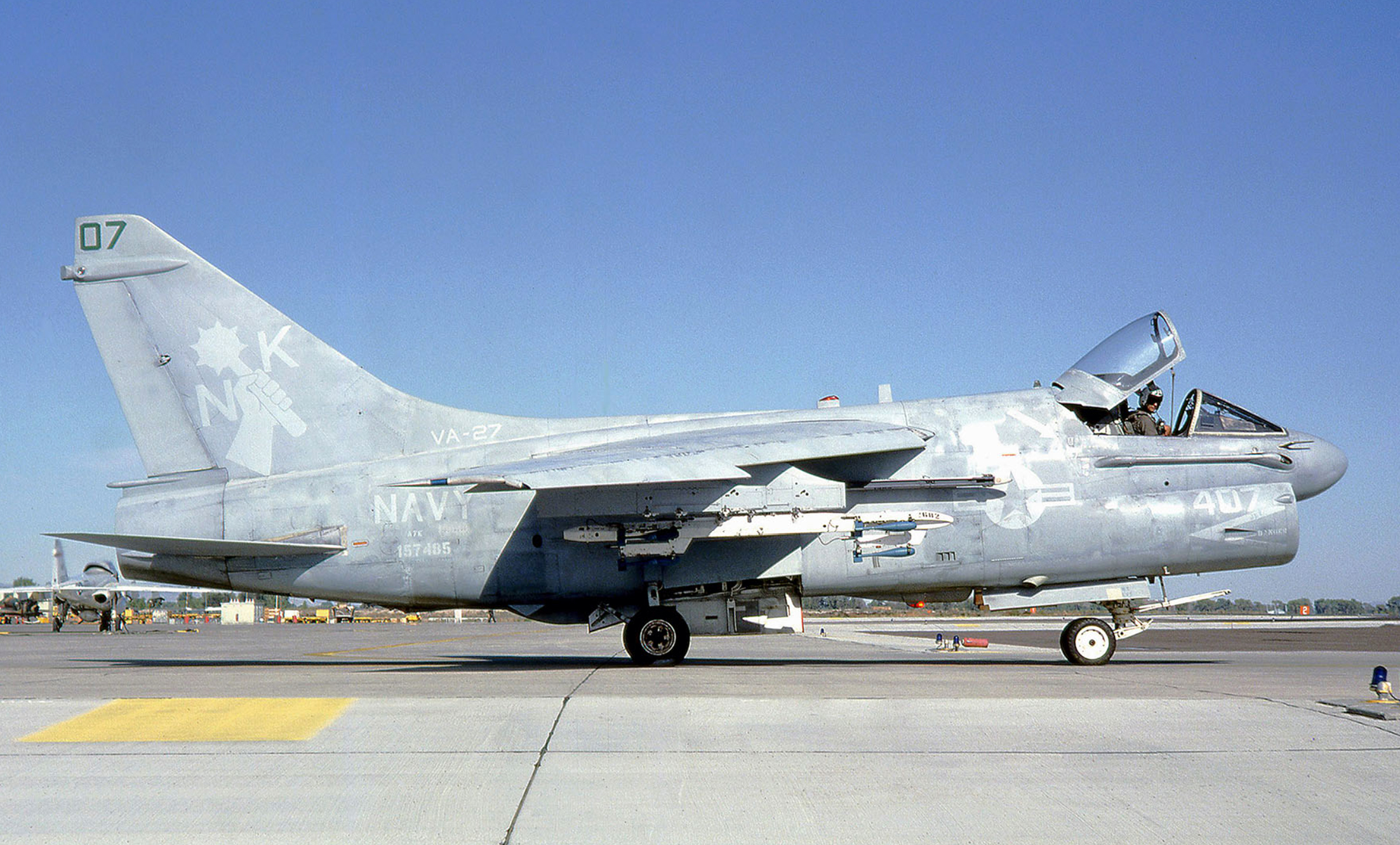 1983 - VA-27 A-7E Corsair II 407 in low-viz paint scheme taxiing out to the runway - unknown location. (Image Source - Rene Francillon)